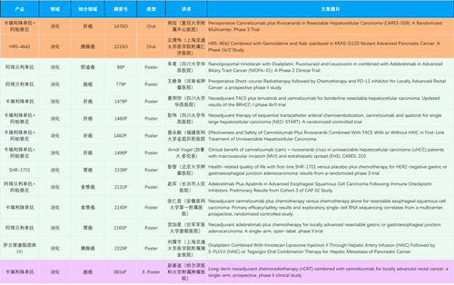 在消化系统肿瘤领域,PA电子产品相关研究共入选2项口头报告、11项壁报和1项电子壁报,共14项研究。除卡瑞利珠单抗和阿帕替尼外,还有4篇阿得贝利单抗治疗消化系统肿瘤研究入选。HRS-4642、瑞拉芙普-α注射液(SHR-1701)等在研创新产品也有相应研究亮相。另有1项伊立替康脂质体(II)用于胰腺癌治疗的研究入选壁报。